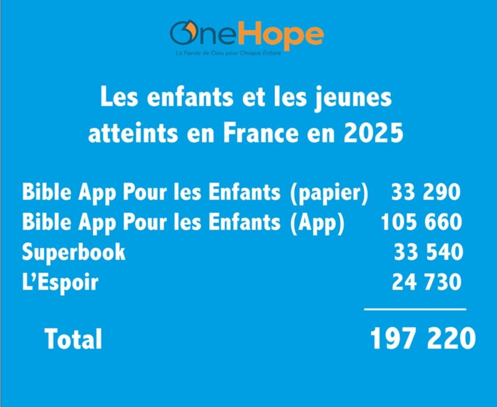 Voici le nombre d’enfants et de jeunes qui ont reçu l’une des ressources de OneHope au cours de l’année 2025 en France. Un grand MERCI à vous tous qui avez contribué à cette mission auprès de la nouvelle génération.